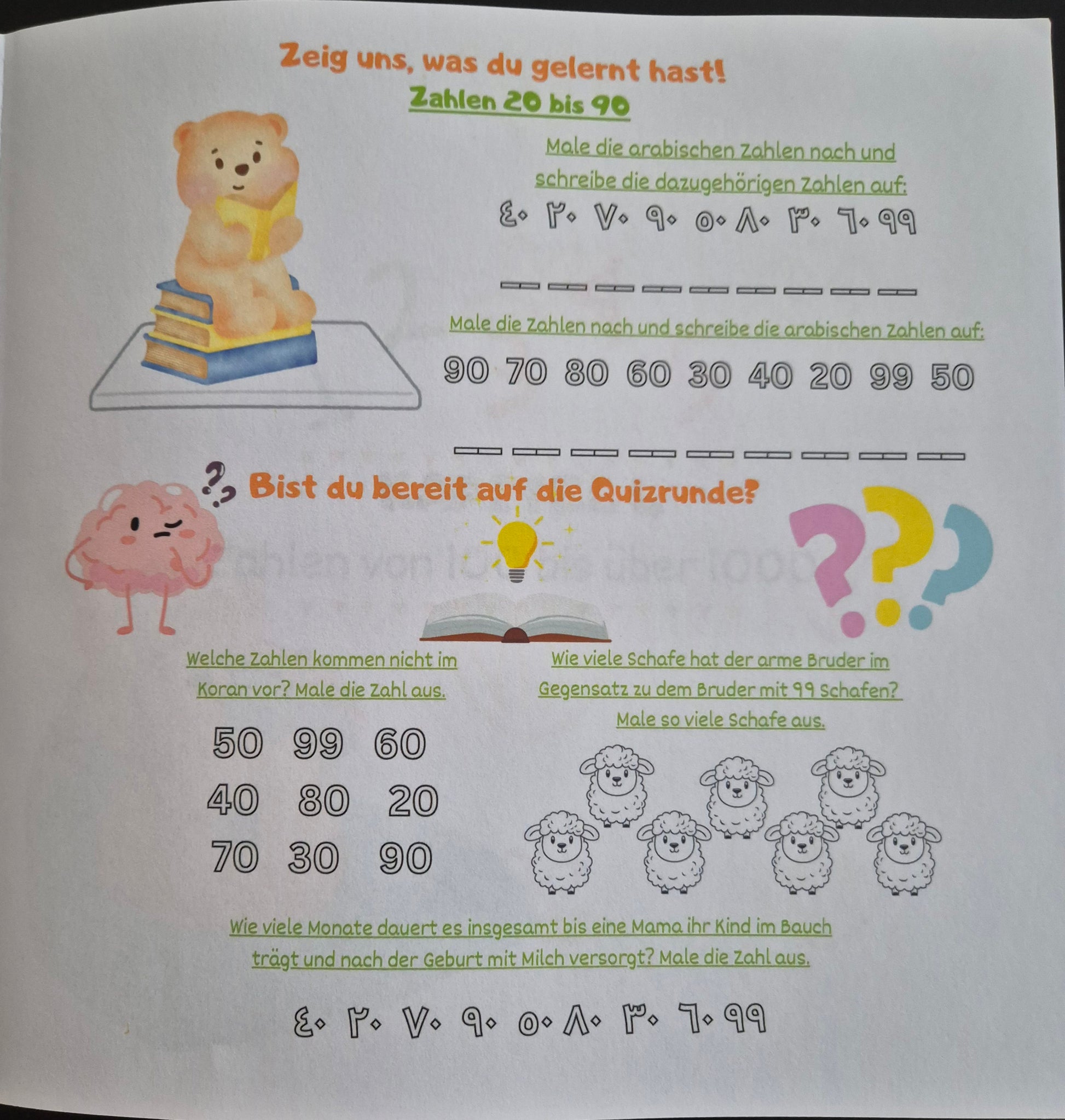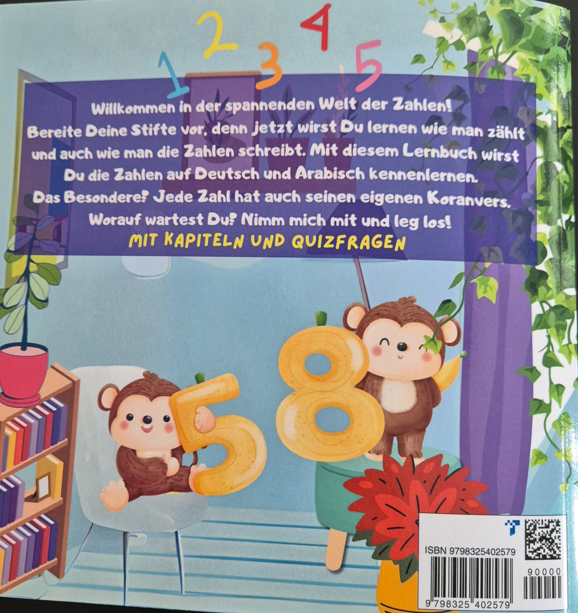Mit diesem Lernbuch kann man die Zahlen auf Deutscg und Arabisch kennenlernen. Das Besondere? Jede Zahl hat auch seinen eigenen Koranvers.